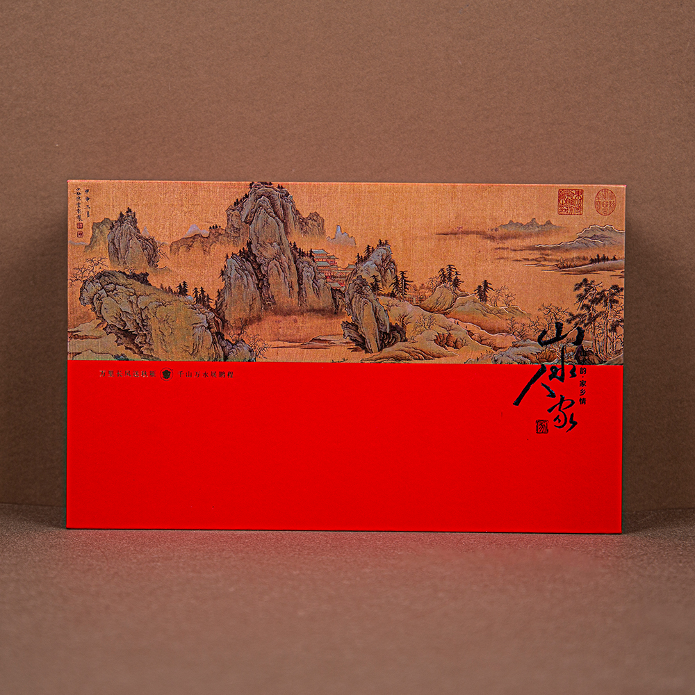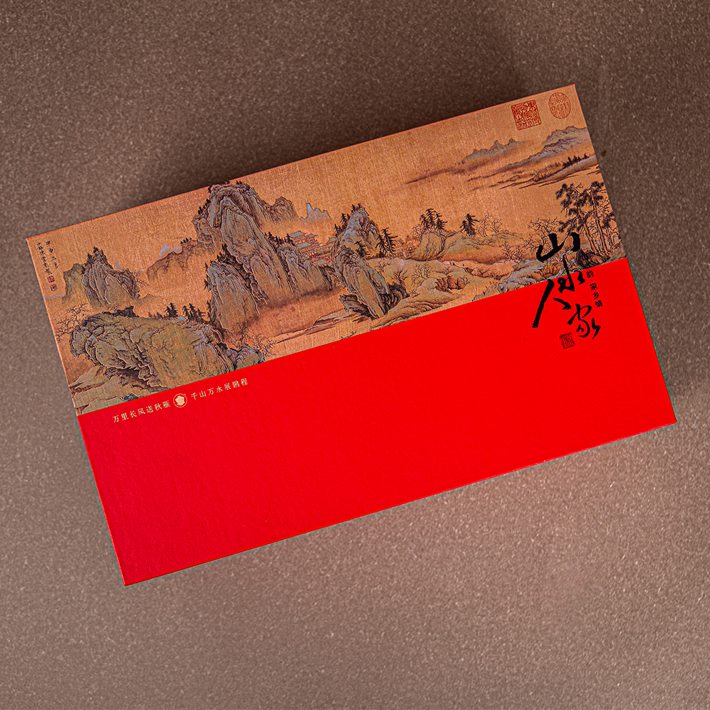 The landscape scroll lining the lid's interior is the soul of this design. Unlike simple printed patterns, this “River and Mountains in the Embrace” image employs a “close-up” technique—extracting the most textured mountain ranges from the ancient painting and using high-definition micro-spray technology to recreate the subtle gradations of dry and wet brushstrokes in the blue-green landscape. Even the rock textures and water patterns are clearly visible. The vertical inscription “River and Mountain in One's Embrace” on the left is handwritten in small regular script by a calligrapher, then scanned and reproduced, allowing the flying white and ink nuances to flow naturally between the brushstrokes. The vermilion seal “Tea Smoke Rises” in the lower right corner serves as the finishing touch, evoking the poetic imagery of “wispy tea smoke drifting, mountains and rivers entering dreams.” Opening the lid unfolds a tangible, three-dimensional painting, transforming the act of retrieving tea into a dialogue with traditional culture.