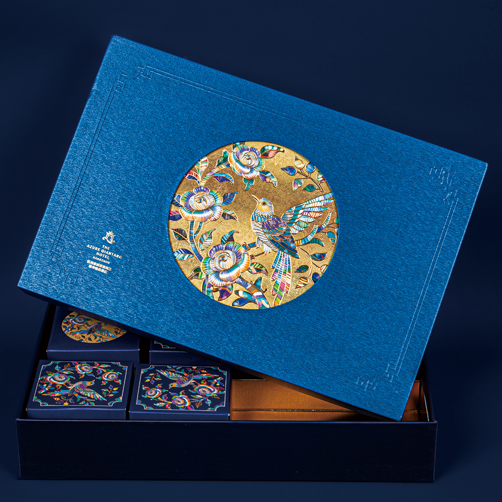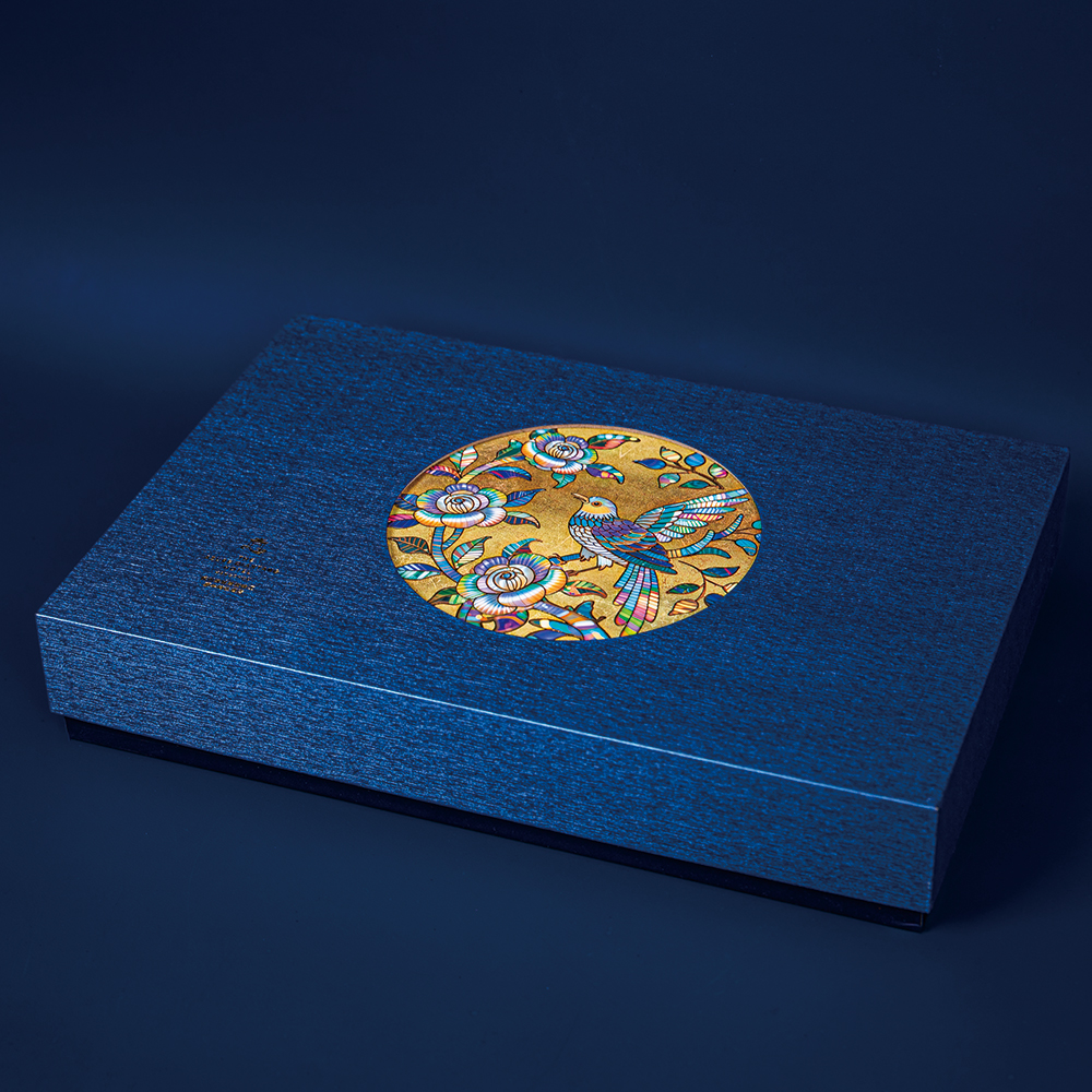 This Heaven-Earth Lid Box features a neat rectangular shape. Its “heaven lid” and “earth box” structure creates a sense of ceremony with every open and close. Its bold yet dignified lines, paired with a deep blue base and gold national-chic patterns, evoke the traditional reunion spirit of Mid-Autumn while conveying a sense of “connecting heaven and earth” through its three-dimensional lid-and-base structure. Whether displayed on a desk or presented as a gift, it embodies the solemnity and elegance expected of a Mid-Autumn gift box, perfectly aligning with the Chinese pursuit of “ceremony and style” in festive customs.