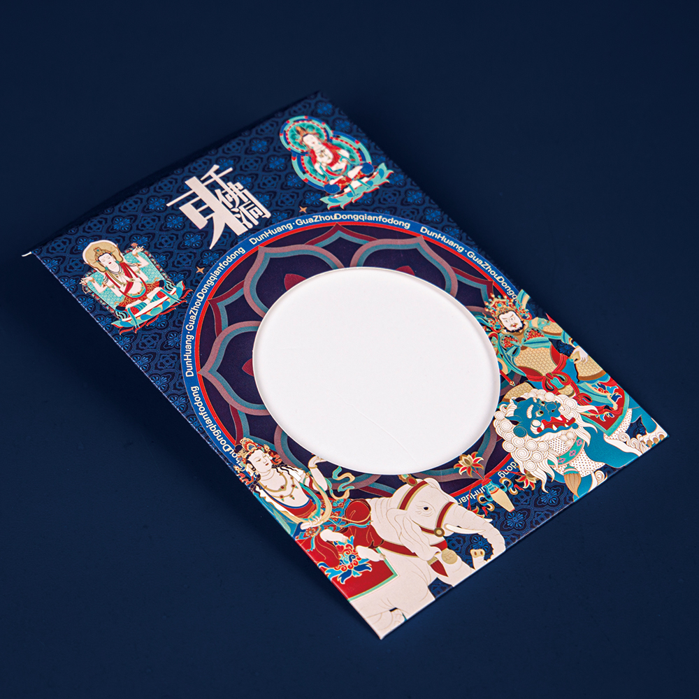 Masterful artistry shines through in the production. The Dunhuang patterns on the envelope combine **high-definition color printing with spot foil stamping**. The intricate textures of the figures' garments and the vibrant, layered hues of the mythical beasts appear vividly against the deep blue background, as if replicating the murals of the Eastern Buddha Caves onto the envelope. The precision cutouts along the edges feature smooth, burr-free lines, with every detail meticulously crafted to evoke the rich cultural essence of Dunhuang. The secure adhesive closure ensures both the privacy of correspondence and the uncompromised presentation of cultural artistry.