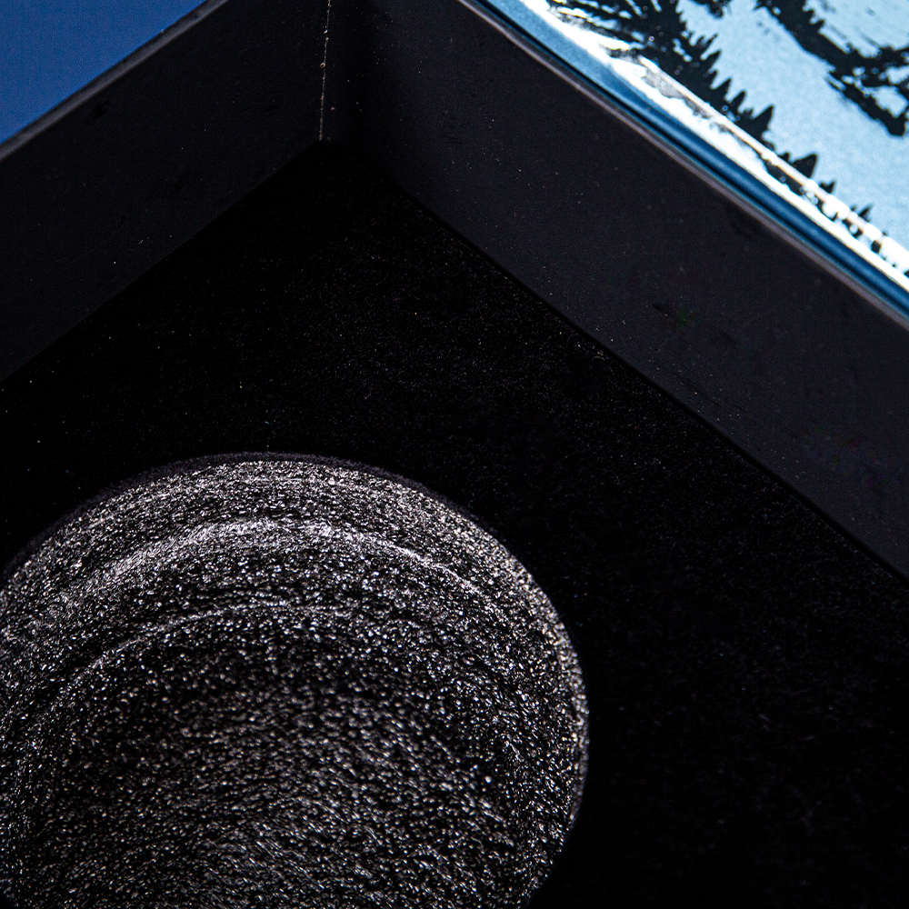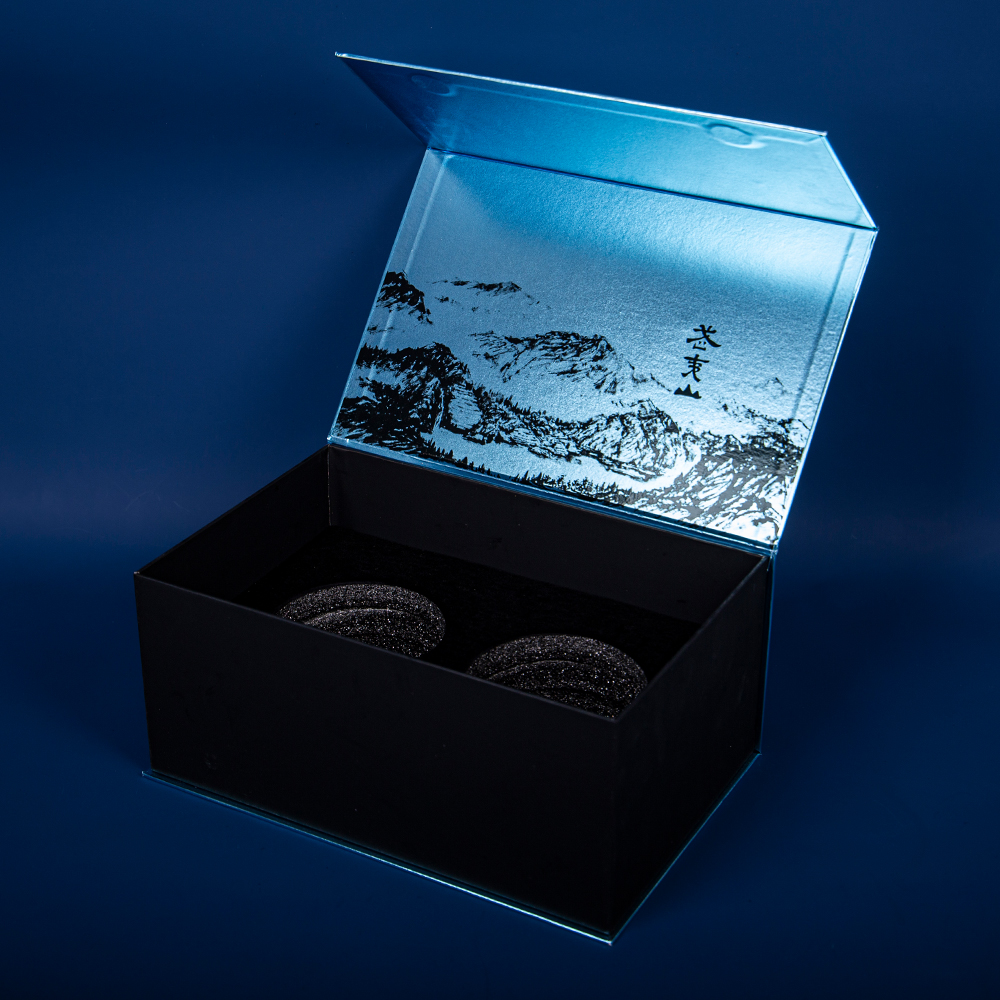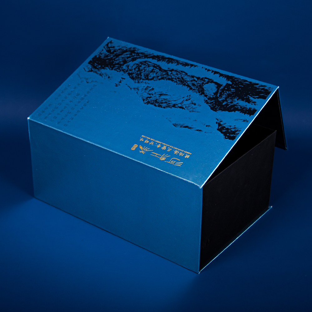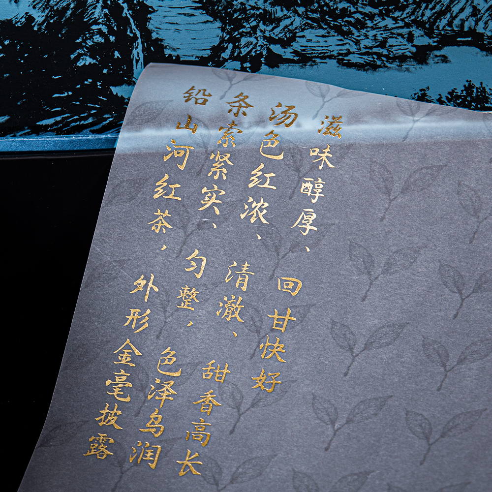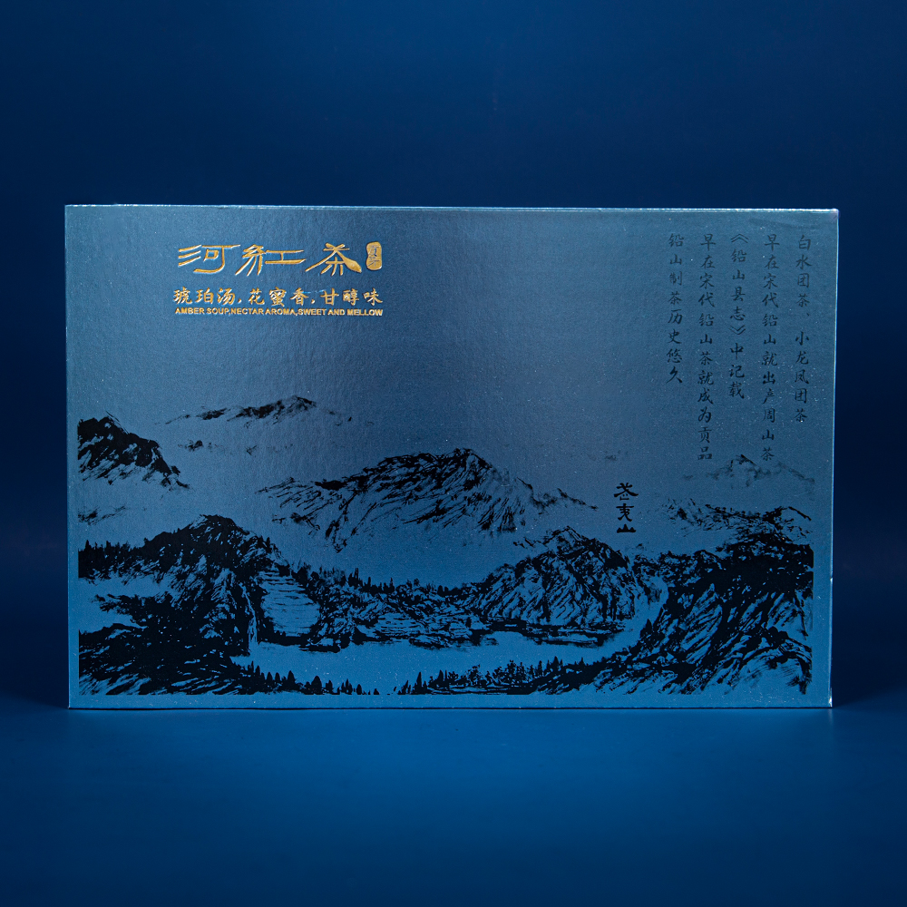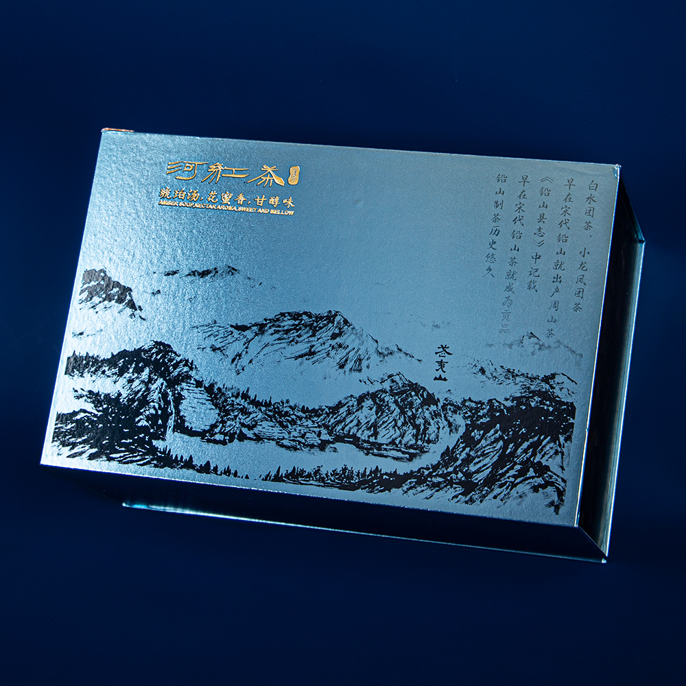The craftsmanship reveals true artistry. The landscape pattern on the box lid combines gold foil stamping with embossing techniques. The mountain contours are three-dimensional and sharp, with every detail of peaks and forests carved to vivid perfection, as if condensing an ink-wash landscape painting onto the box body. The “He Hongcha” text and description, executed in gold foil stamping, shimmer brilliantly against the deep blue background. The edges are clean and precise, showcasing the meticulous craftsmanship. The hinge connection of the lid is smooth and natural, with a perfectly balanced damping effect when opening and closing. Each opening offers an immersive experience of Eastern craftsmanship.