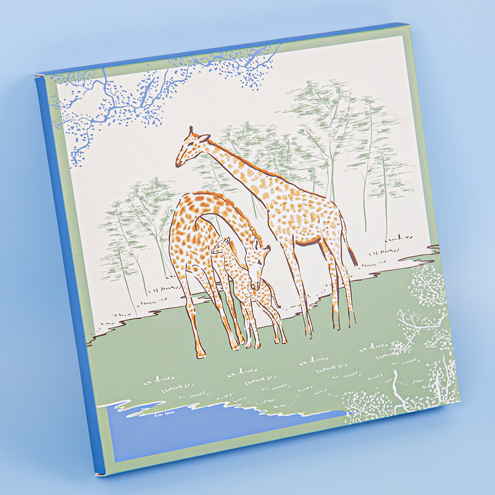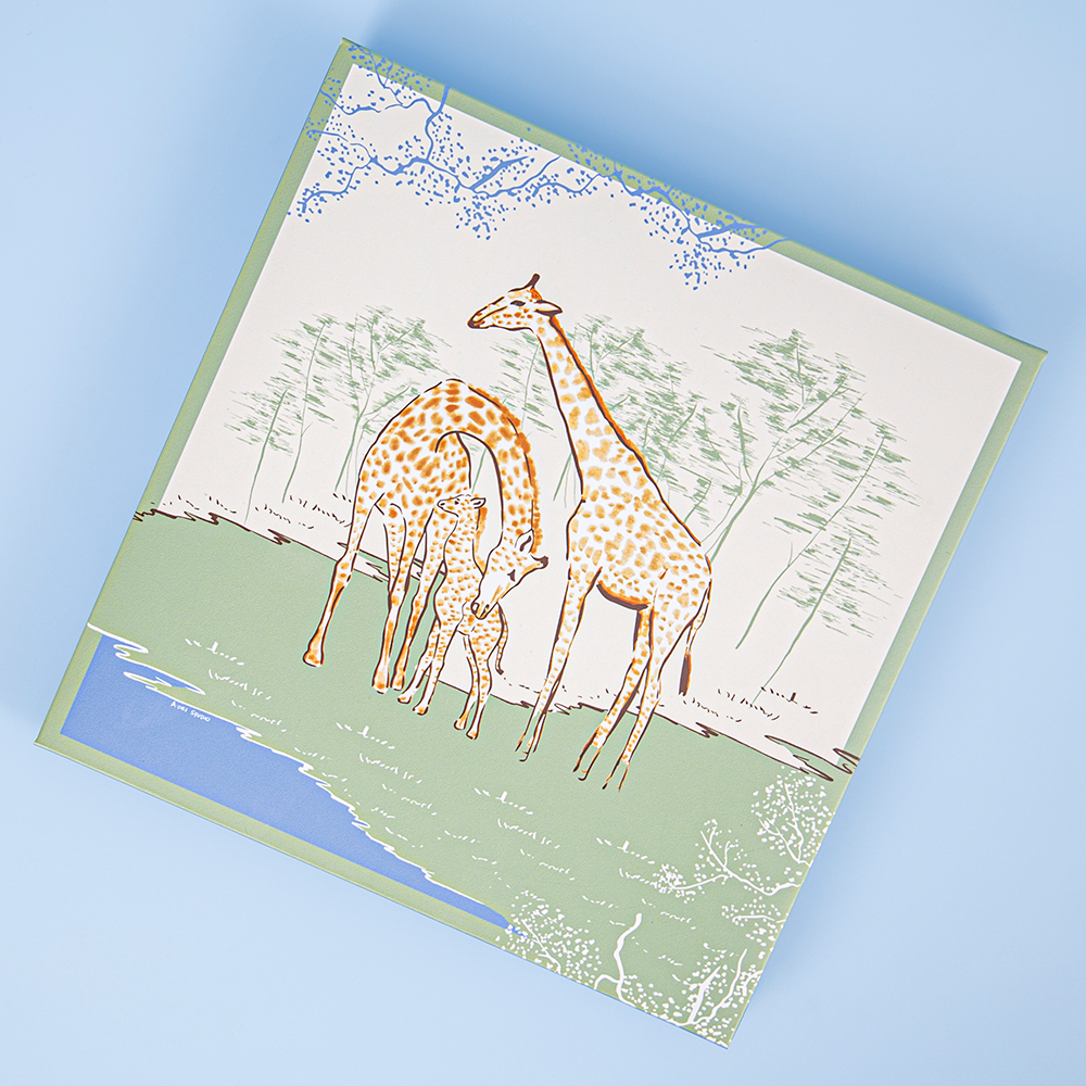 The giraffe illustration on the lid employs offset printing: warm orange spots against pale green grasslands create a soothing palette, with delicate, flowing lines capturing the giraffe's relaxed, natural demeanour. Even the distant forest is rendered with distinct layers. With high colour fidelity, the print resists smudging or fading, securely “locking” the vitality and gentleness of the savannah onto the box surface. The packaging itself becomes a collectible miniature artwork.