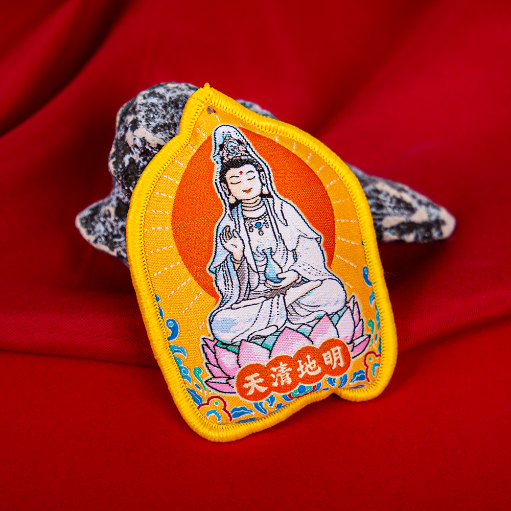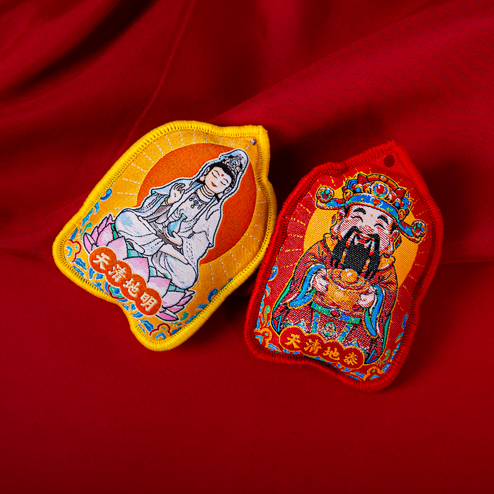 The Guanyin and God of Wealth figures on the sachets employ intricate colour embroidery: the stitches for eyebrows, eyes, and drapery are uniformly neat. Even the gold ingot held by the God of Wealth and the lotus beneath Guanyin's feet are embroidered with three-dimensional vibrancy. The characters for ‘Heavenly Clarity, Earthly Radiance’ are seamlessly integrated, their rounded, full-bodied script blending with the patterns rather than sitting flat like printed text – truly ‘auspicious intent woven stitch by stitch’.