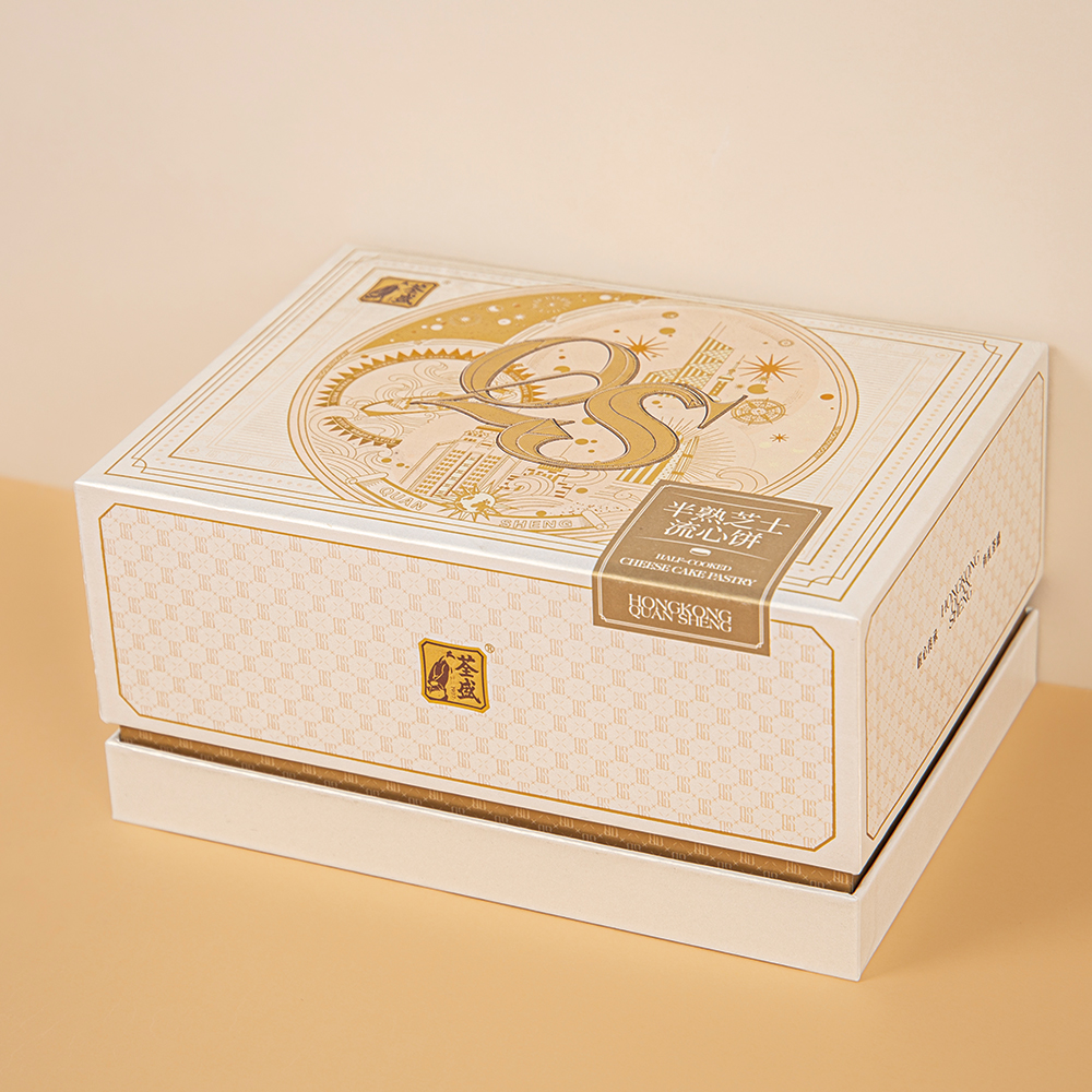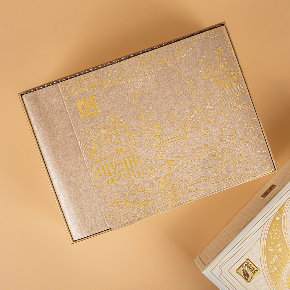 The box offers ample space for content, allowing for flexible design tailored to the mooncake product: whether it’s the product name, flavor descriptions, brand story, or Mid-Autumn Festival greetings, all can be perfectly presented through techniques like hot stamping and embossing. The “Soft-Centered Cheese Mooncake” label shown in the image, paired with the brand logo and oriental architectural motifs, not only highlights the product’s characteristics but also conveys the brand’s elegant tone, making the packaging an integral part of the product and enhancing its overall perceived value.