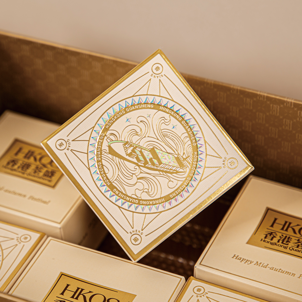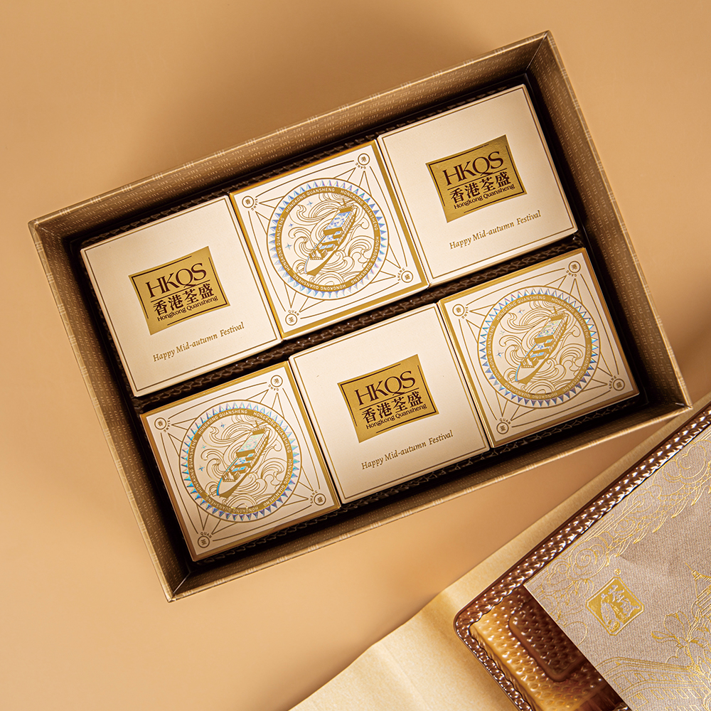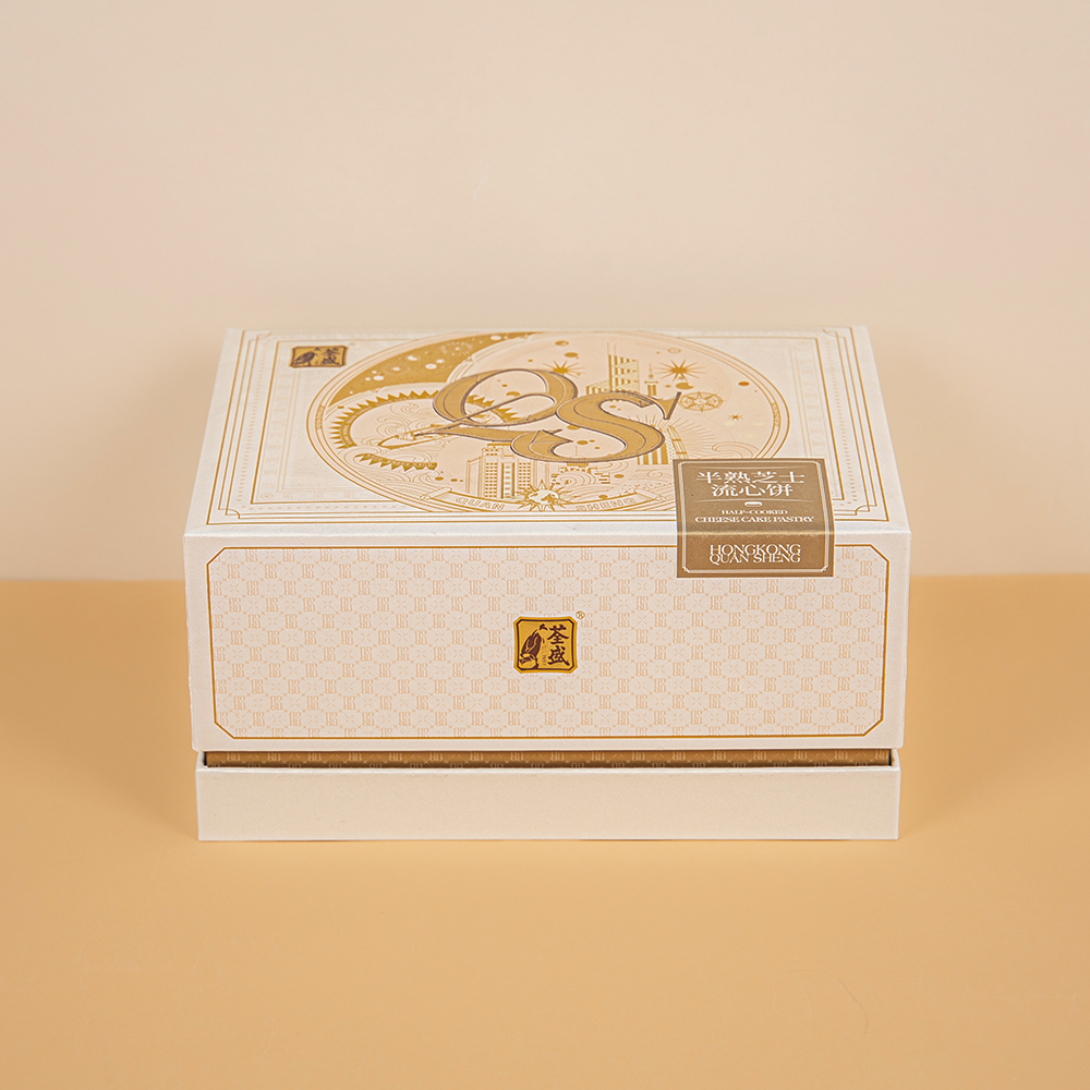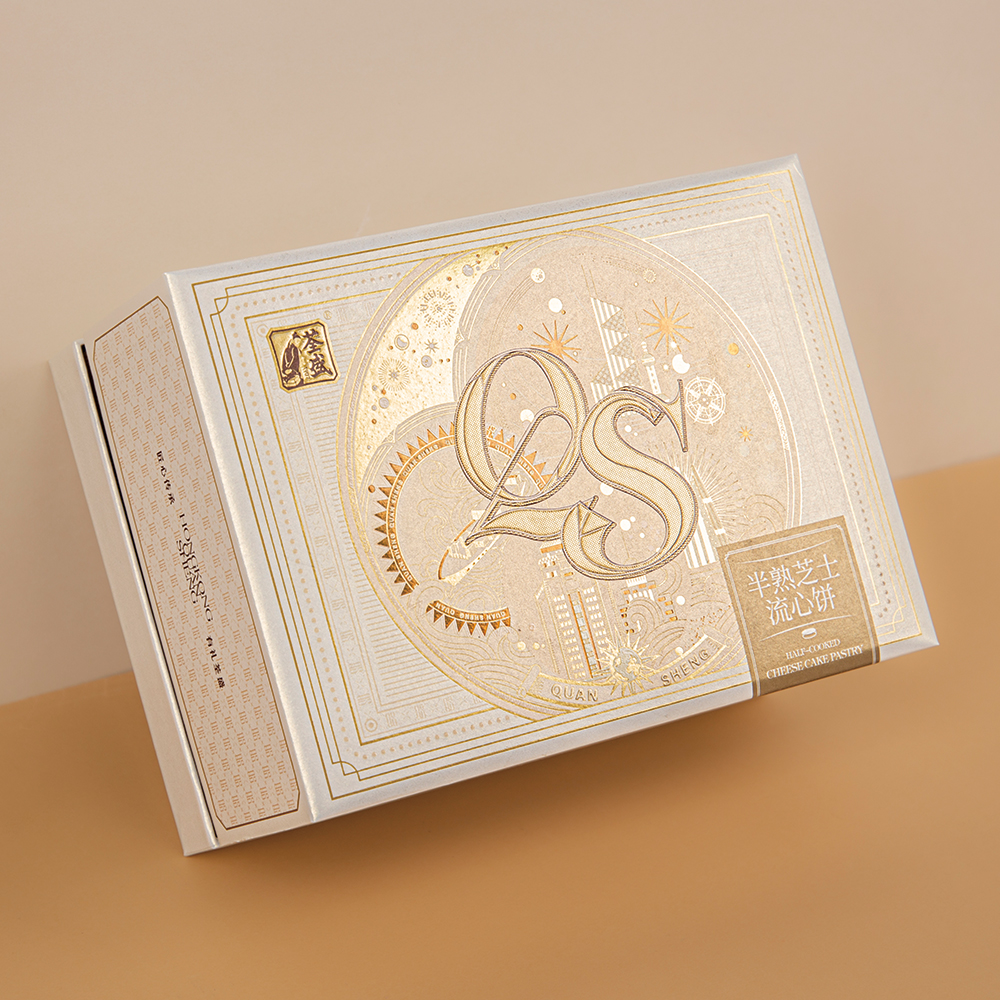 The box is constructed from heavyweight cardboard, ensuring a sturdy and rigid structure that is resistant to pressure and impact, effectively protecting the mooncakes from crushing or bruising. The surface is finished with a matte laminate, offering a smooth, velvety texture that is scratch-resistant and durable, ensuring it remains pristine even with prolonged use. In terms of craftsmanship, high-precision foil stamping is employed. The “QS” letters, cityscape motifs, and brand logo on the box’s surface are rendered with delicate golden lines. The luster is soft and understated, shimmering brilliantly against the creamy white background to create a luxurious yet understated atmosphere. The subtle embossed patterns on the sides are exquisitely crafted, revealing intricate details within understated elegance, with every element showcasing a commitment to quality.