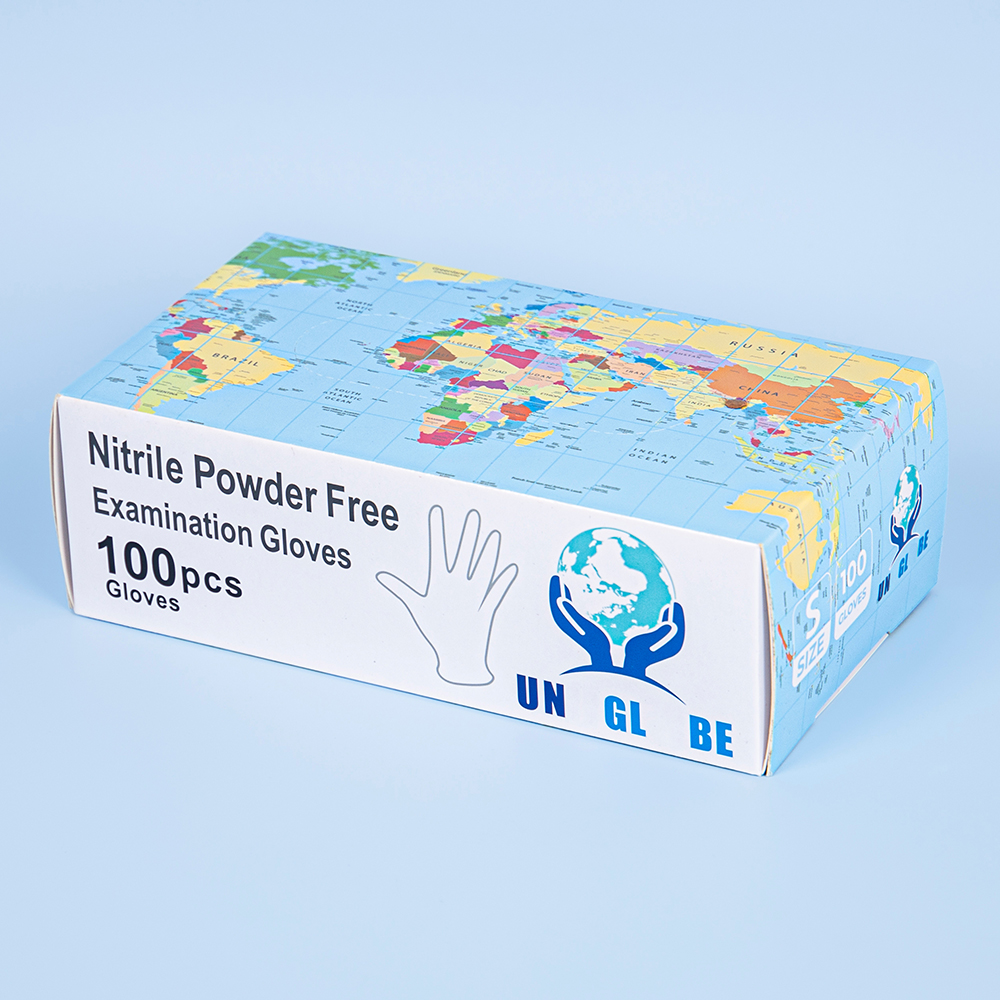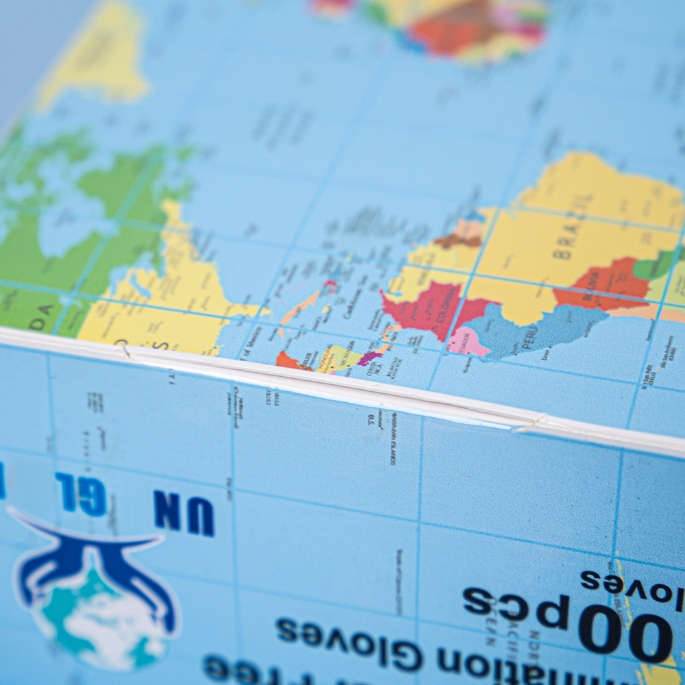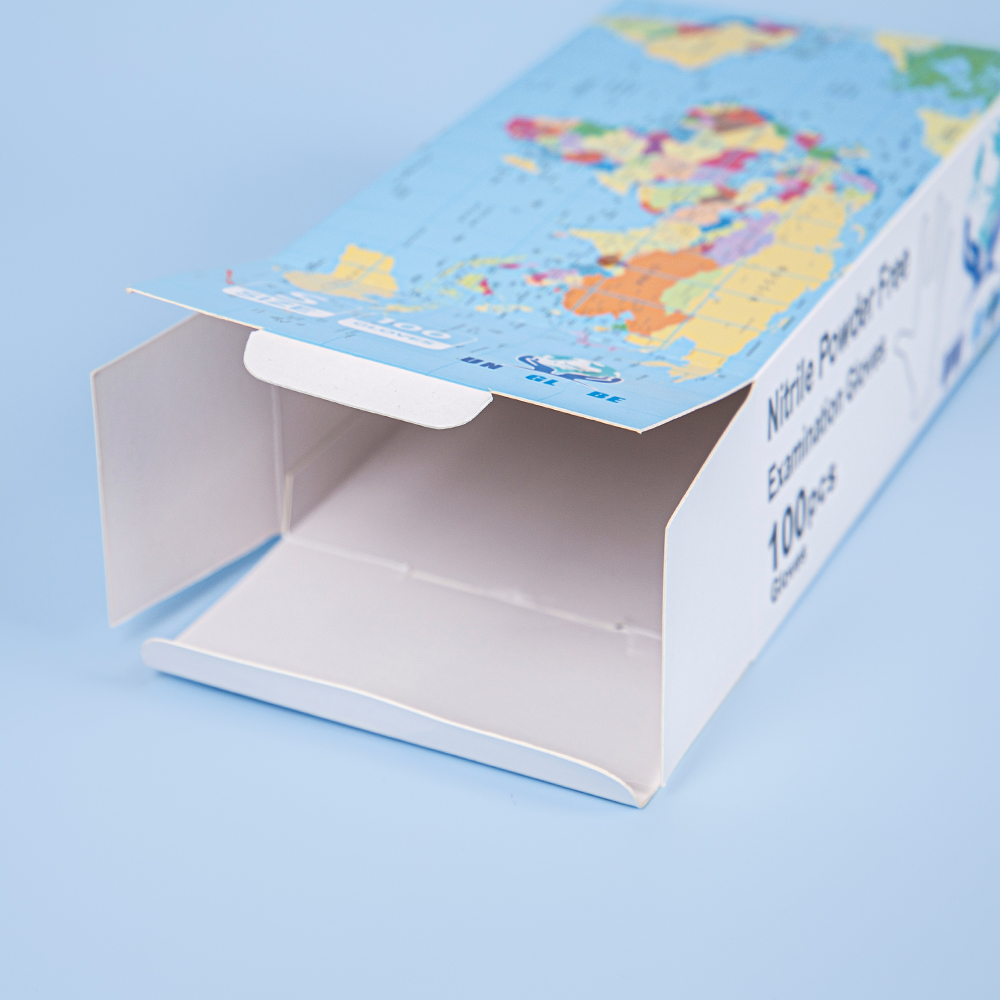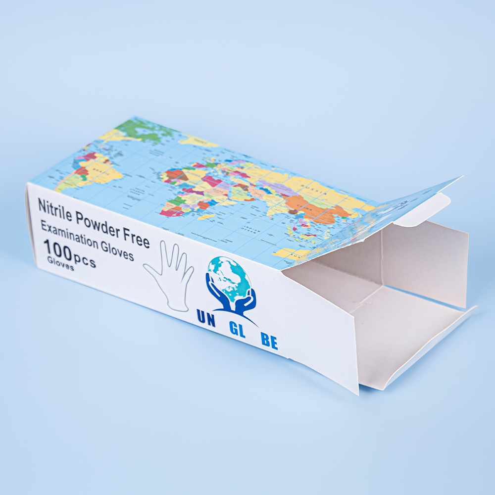 For the material, high-grammage white cardstock is used as the base. The box remains rigid and resistant to deformation, offering strong compression resistance to effectively cushion impacts during transport and provide reliable protection for the gloves. The surface is coated with a matte laminate that is scratch-resistant, wear-resistant, moisture-proof, and stain-resistant, keeping the box clean for a long time while ensuring the printed colors remain clear and vibrant without fading over time. In terms of craftsmanship, high-precision four-color printing is employed. The world map features high color fidelity, with clear and sharp country outlines and text annotations. Product names, specifications, and other information are printed neatly. Every detail meets professional standards for medical supplies, resulting in a solid and reliable texture.