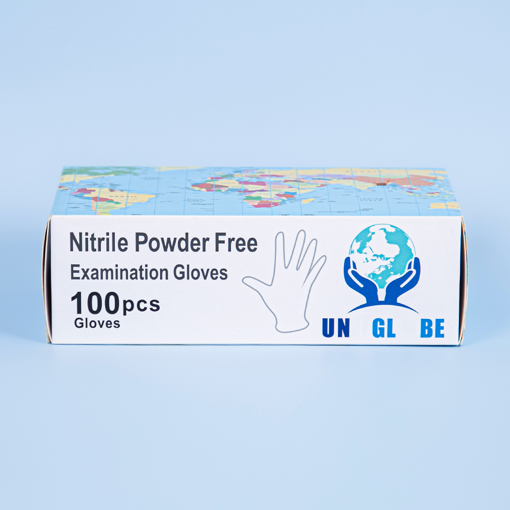 The box’s content design is clear and intuitive. The front features a world map as the visual focal point, conveying the brand’s global professional positioning. The sides clearly display core information such as “Nitrile Powder-Free Examination Gloves” and “100pcs Gloves,” allowing users to quickly understand product attributes and specifications. These details are complemented by a glove illustration and the brand logo to enhance brand recognition.