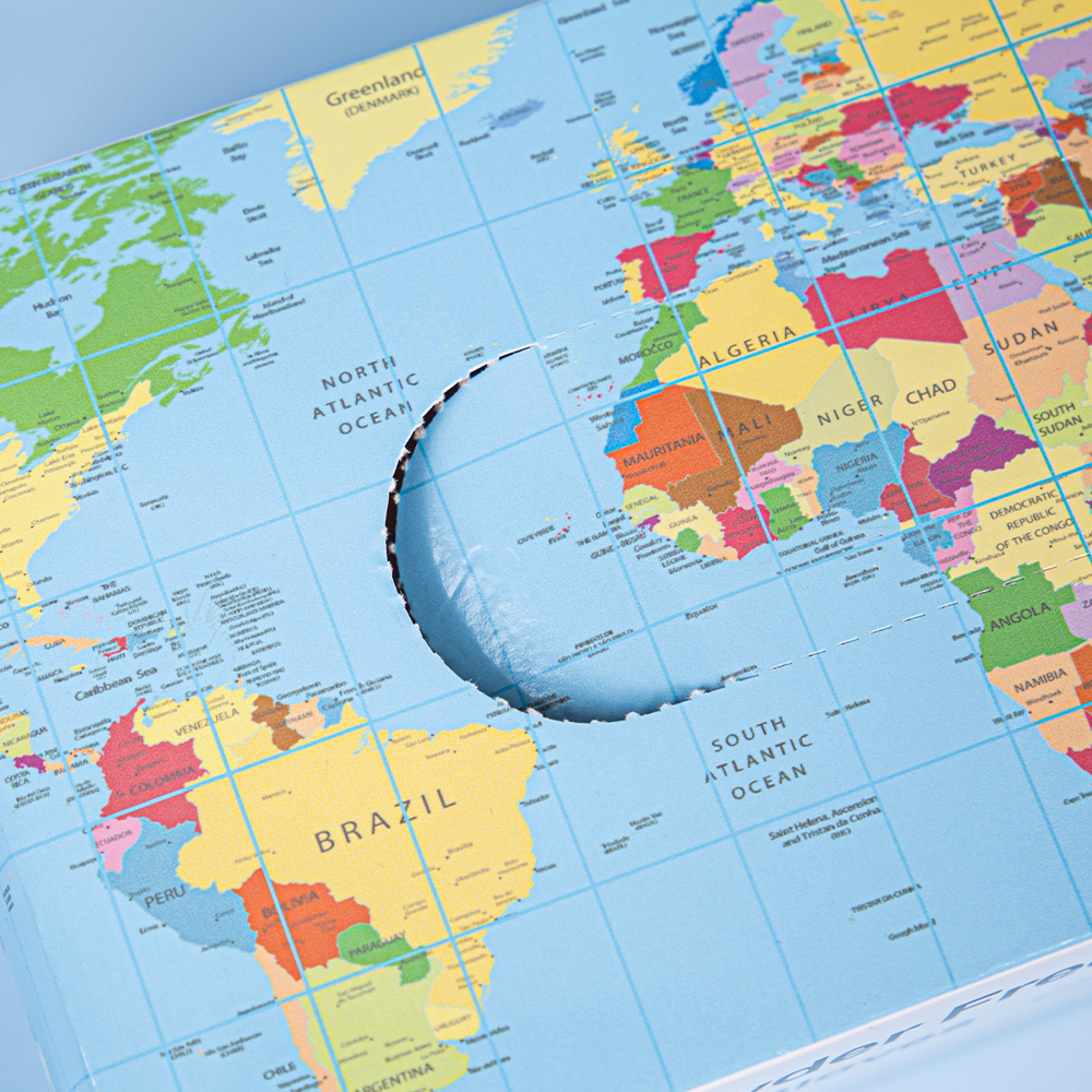 This glove box features a classic rectangular top-and-bottom lid / snap-bottom structure. The box is neat and sturdy, perfectly suited for storing 100 pairs of nitrile gloves. The box’s balanced length-to-width ratio facilitates stacking, storage, and transportation while maximizing the visibility of the box’s design on store shelves, ensuring product information is immediately apparent. The box features a large-scale world map design on the front, creating a strong visual impact, while the sides clearly display key product information—blending aesthetics with practicality. The sturdy opening mechanism effectively protects the gloves from crushing and contamination, ensuring product hygiene.