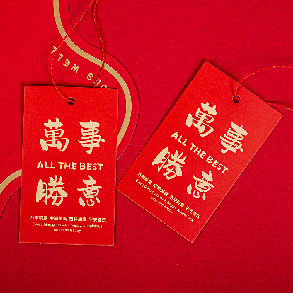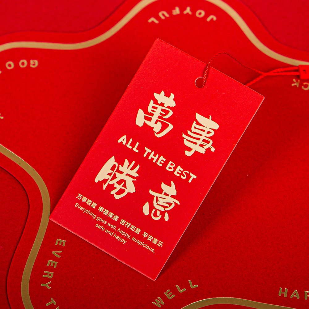 The tag's ‘May All Endeavours Prosper’ employs gold foil stamping: the rounded, full-bodied font boasts a soft, understated sheen that perfectly complements the deep red background, creating just the right festive atmosphere. The bilingual blessings in smaller type remain crisp and clear, free from smudging or blurring. The embossed characters offer a subtle tactile texture, as if the ‘blessings’ were physically etched into the cardstock.
