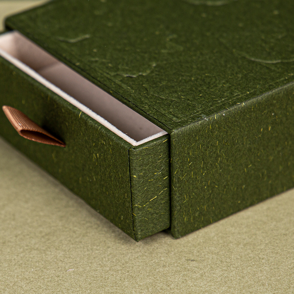 Crafted from dark green cardstock with a plant-fibre texture, the box offers a tactile experience: coarse yet refined paper grain that feels substantial, unlike the flimsiness of smooth cardboard. Sufficiently sturdy, it resists sagging when drawn open. The textured surface carries an inherent vintage ‘antique feel,’ revealing subtle fibre sheen under light. In hand, it offers an elegant ‘light yet substantial’ weight.