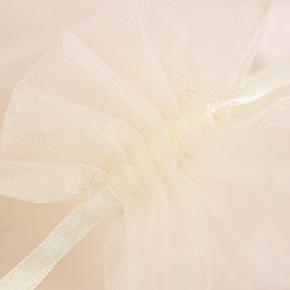 The drawstring at the bag's opening features a matching satin ribbon, its smooth texture perfectly complementing the organza's ethereal lightness. The knot forms naturally and effortlessly, eschewing neatness for a touch of handmade warmth. The ribbon's soft sheen catches the light with a delicate glow, embedding the ritual of “gentle wrapping” within understated details.