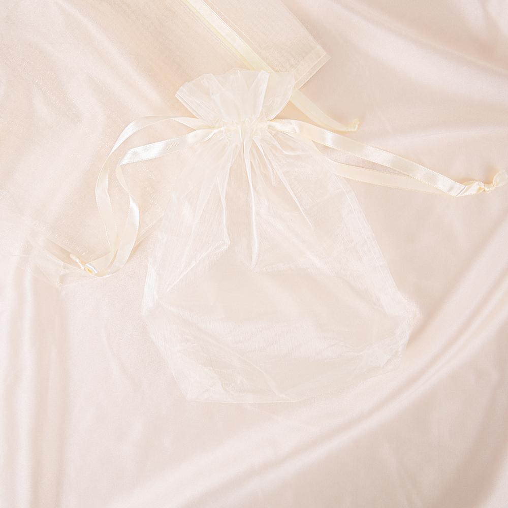 Crafted from delicate organza, the bag offers a smooth, velvety feel with subtle texture—free from the roughness of ordinary gauze. Its semi-translucent quality subtly reveals the contours of contents without exposing details, like a soft-focus filter. Yet it remains resilient enough to hold jewelry without snagging or tearing—a gentle carrier that's “light yet resilient.”
